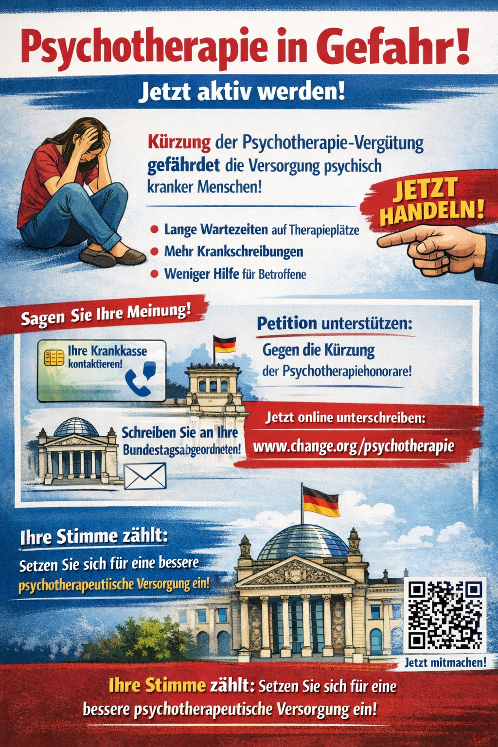 Wenn Ihnen eine gute Versorgung psychisch erkrankter Menschen wichtig ist, können Sie Ihre Stimme ebenfalls einbringen – etwa durch Rückmeldungen an Krankenkassen, politische Entscheidungsträger oder durch Unterstützung entsprechender Petitionen.